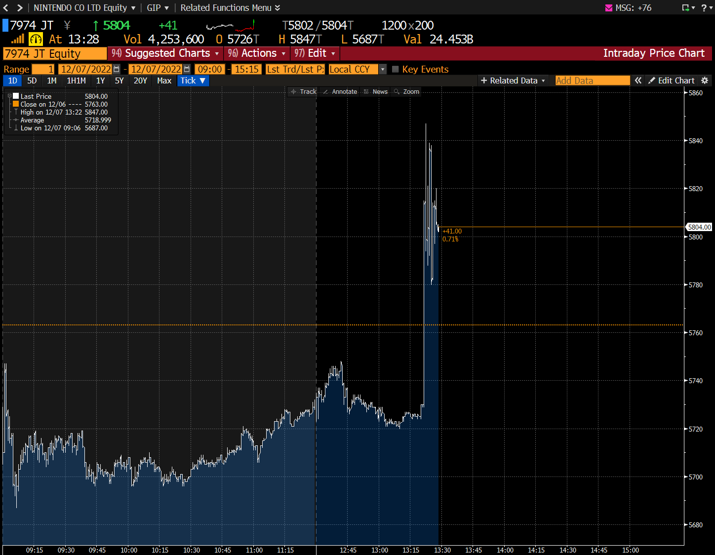 A seguito dell’annuncio, le azioni di Nintendo sono schizzate alle stelle, come testimonia l grafico sottostante: