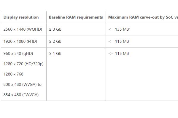 Ad ogni modo, pubblichiamo a seguire la lista con il minimo di memoria RAM richiesta per le varie risoluzioni del display, accompagnata dai nuovi requisiti minimi.