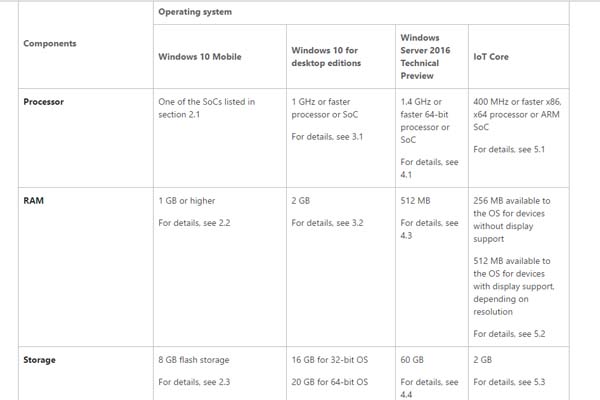 Sembra che con Windows 10 Mobile Redstone 1, alias Anniversary update, non sarà possibile avere dispositivi con meno di 1 GB di memoria RAM e 8 GB di Storage, sebbene, in precedenza, Microsoft avesse accennato ad una maggiore flessibilità per i dispositivi con 4 GB di Storage, a patto di possedere una microSD.