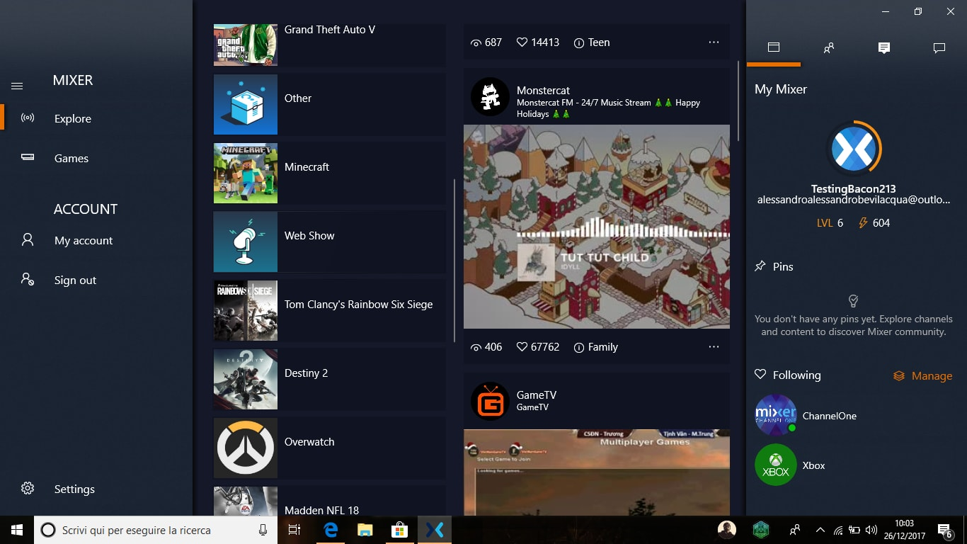 In un secondo momento l’applicazione Mixer è stata poi integrata all’interno del sistema di Xbox One e nella Game Bar di Windows 10 che, ricordiamo, permette di registrare e condividere sessioni di gioco all’interno del sistema operativo.
