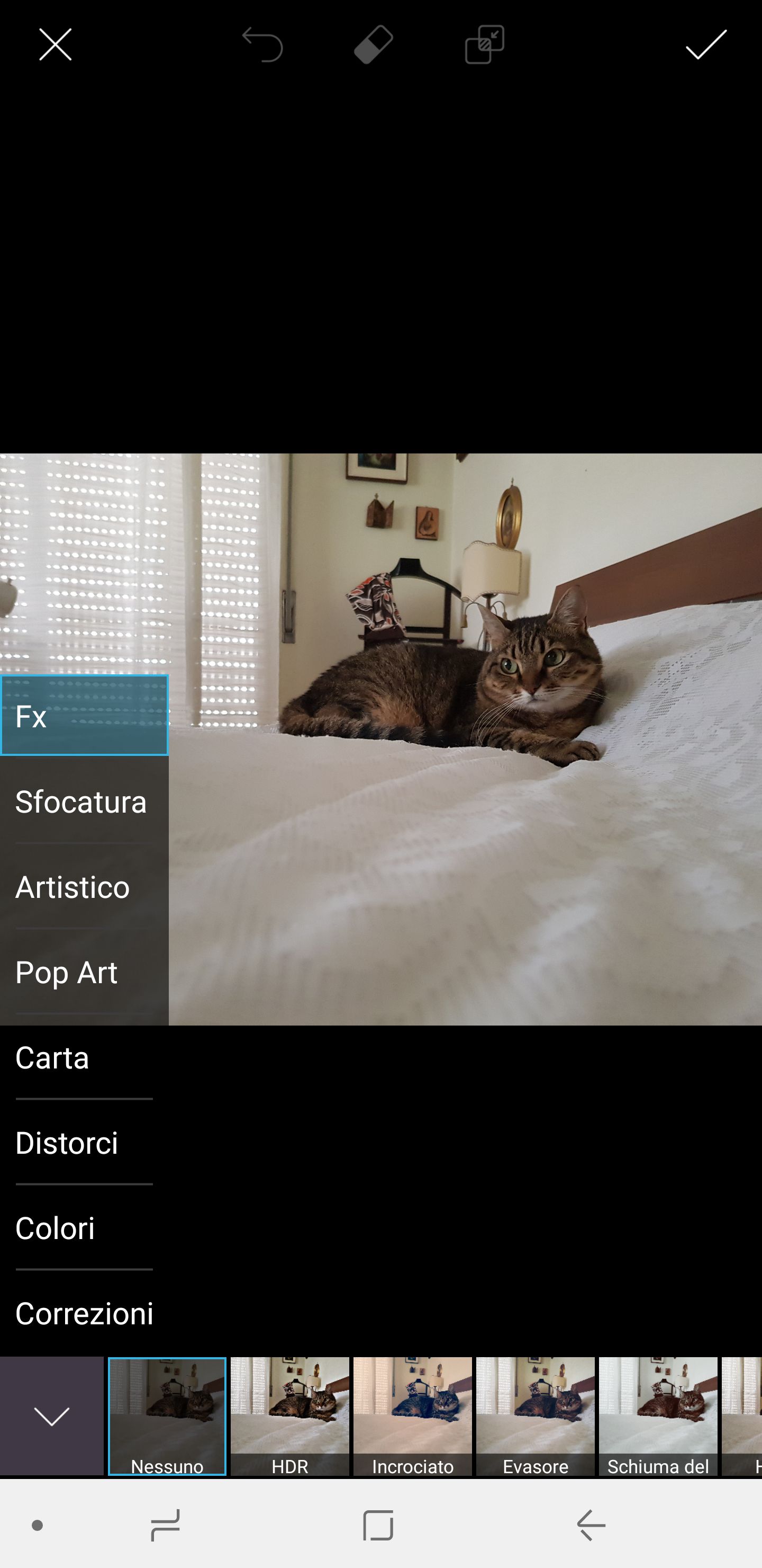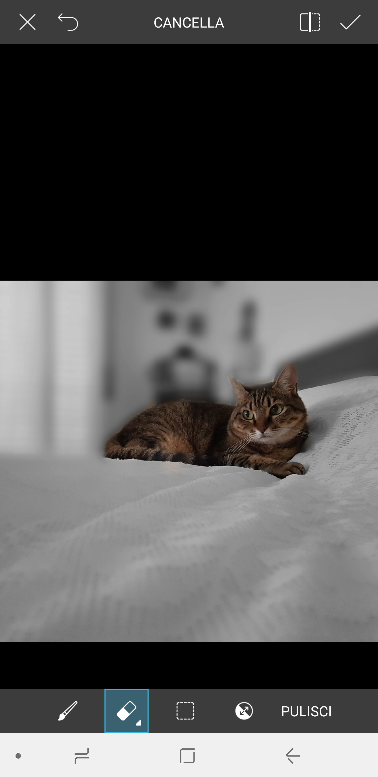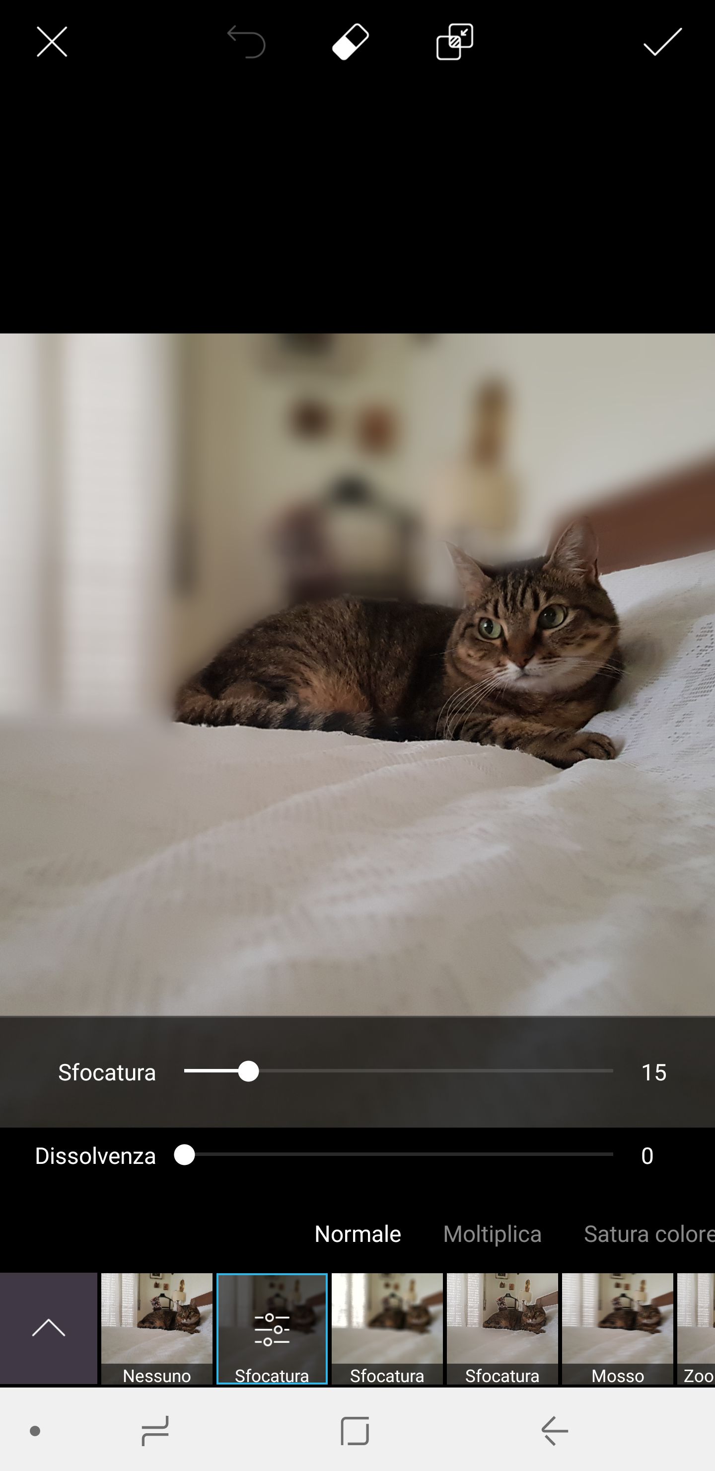 Rechiamoci all’interno della scheda “effetti” e qui selezioniamo un filtro di nostro interesse. Io ho selezionato in primis un filtro “sfocatura” per andare a sfumare l’area dietro questa bellissima miciona. Potremmo utilizzare gli strumenti in alto ed in basso per il pennello e la gomma da cancellare che servono rispettivamente per applicare e rimuovere il filtro nelle zone di nostri interesse. Una volta effettuata la modifica clicchiamo su “fatto” in alto.