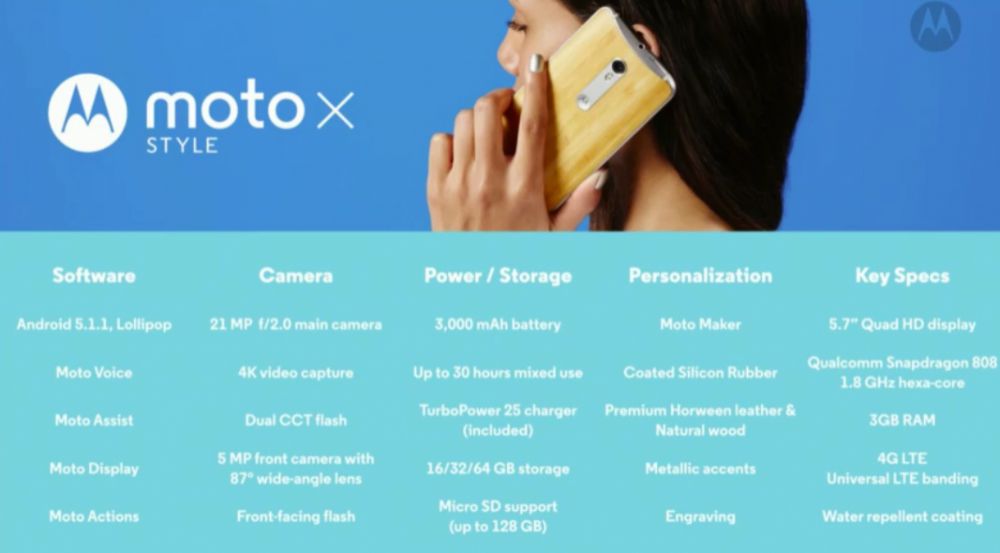Motorola oggi ha presentato a New York la versione Style del nuovo Moto X, una variante dall’estetica più raffinata con inserti in metallo ed un ampio display da 5.7 pollici Quad HD (2560×1440 pixel) ed una fotocamera di alta qualià con un sensore da 21 Megapixel, apertura f/2.0, possibilità di registrare in 4K e dual CCT flash. Viene posta inoltre particolare attenzione alla fotocamera frontale grazie ad un sensore da 5 Megapixel, con una lente grandangolare che copre un campo visivo di 87°.