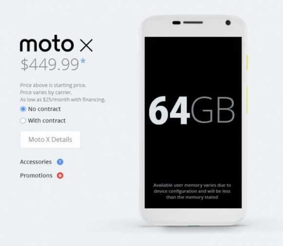 Motorola Moto x da 64GB è venduto ad un prezzo di 449,99 dollari.