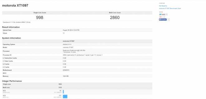 Motorola XT1097: eccola la sigla del presunto dispositivo che è apparso in queste ore su Geekbench: stiamo parlando di uno smartphone top di gamma (sebbene non monti proprio l’ultimo SoC), attorno al quale si è creata grande attesa, non fosse altro per il fatto che quasi ovunque regni la convinzione unanime che si tratti del famigerato Motorola Moto X+1.