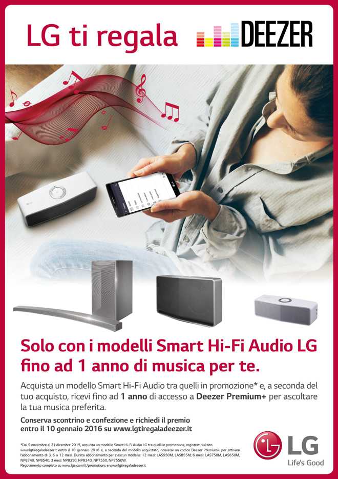 Dal 9 novembre fino al 31 dicembre, tutti coloro che acquisteranno un modello di Smart Hi-Fi Audio LG riceveranno un abbonamento Premium+ di Deezer per ascoltare tutte le canzoni preferite in alta qualità senza pubblicità né interruzioni. Basta registrarsi al sito entro il 10 gennaio 2016 e riscattare il proprio abbonamento Premium+ della validità da 3, 6 o 12 mesi in base al modello acquistato.