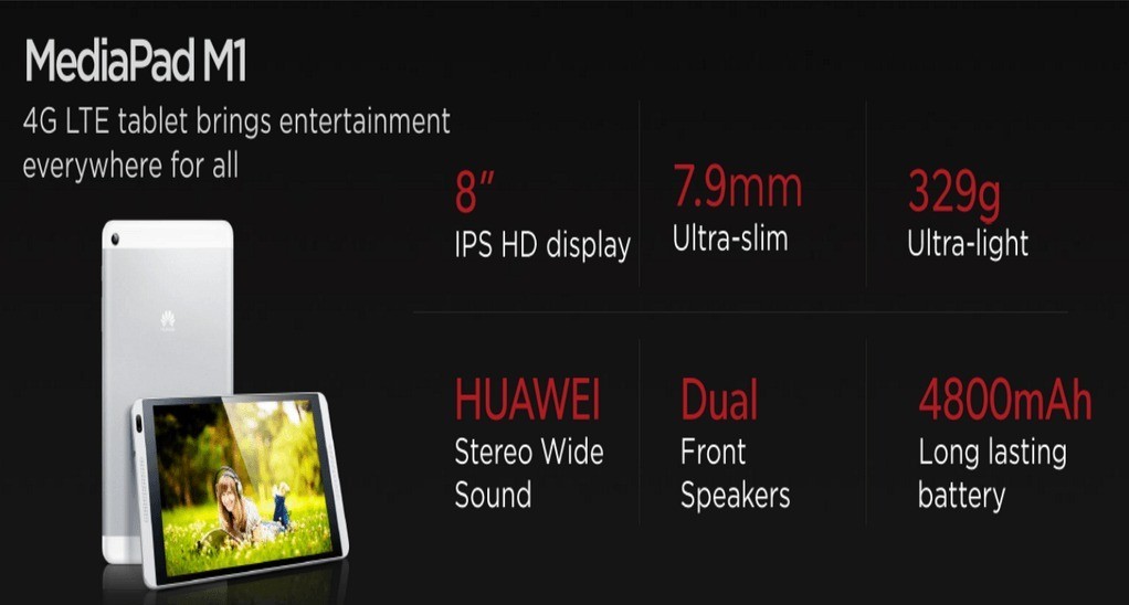 Al MWC 2014, Huawei ha annunciato un nuovo tablet , il MediaPad M1. Anche se è un dispositivo più modesto rispetto al suggestivo X1, l’M1 ha un grande display da 8 pollici con risoluzione di 800×1280 pixel. Completano questo nuovo tablet un processore quad -core 1.6GHz , due altoparlanti frontali e una batteria da 4800 mAh. Secondo Huawei, questa batteria dovrebbe offrire il funzionamento continuo per circa per 8 ore di riproduzione video. Da non dimenticare poi il reparto fotografico rappresentato da due fotocamere: la posteriore da 5 megapixel e l’anteriore da 1 megapixel.