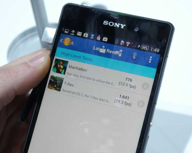 Anche nel benchmark GFX Bench il Sony Xperia Z2, con un punteggio di 776 nel test Manhattan , ha battuto ancora una volta il rivale Galaxy S5.