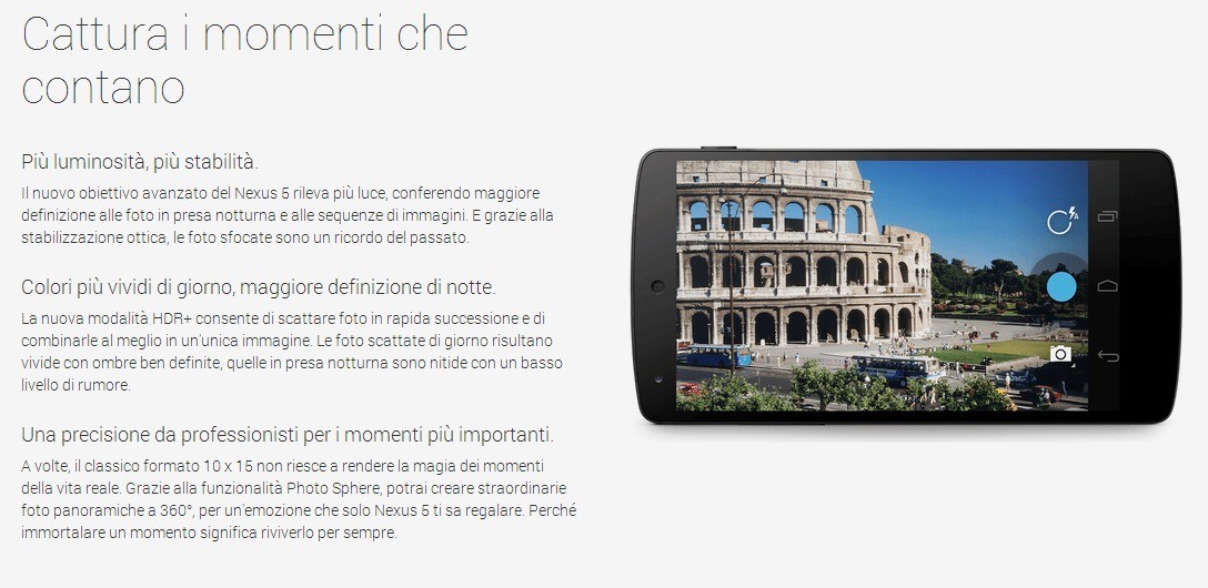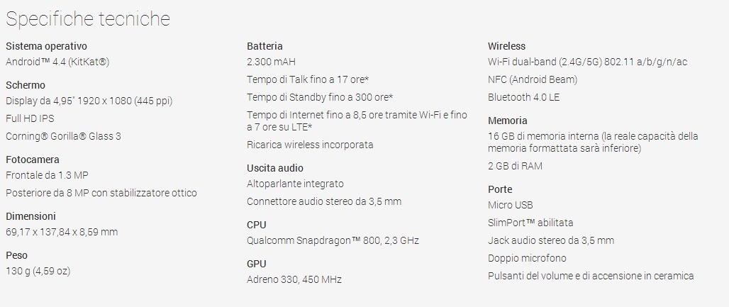 Come potete vedere anche il resto delle caratteristiche che avevamo riportato nei nostri precedenti articoli sono state confermate ufficialmente, ed infatti troviamo a bordo di questo nuovo Nexus 5 una fotocamera posteriore da 8 megapixel, una batteria da 2300mAh, Bluetooth 4.0 Low Energy e supporto alle reti Wi-Fi fino al nuovo standard ac.