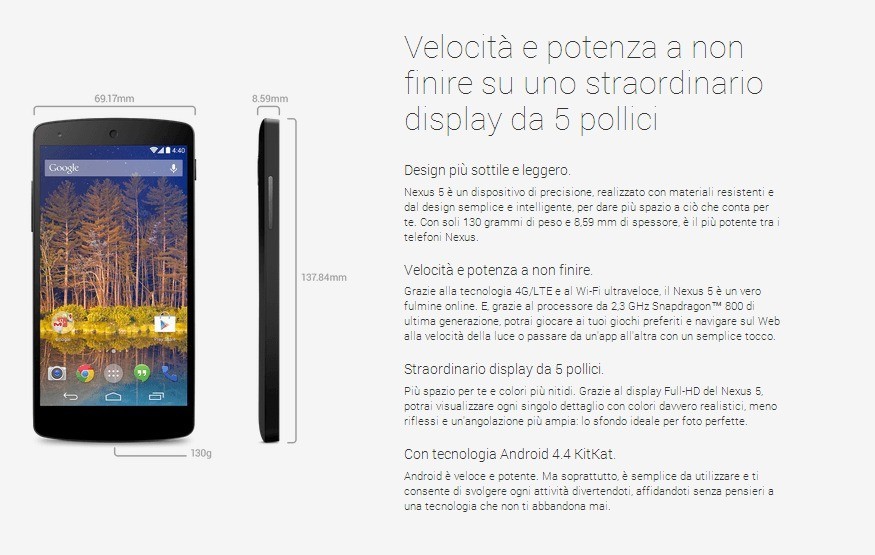 Come trapelato nel corso dei mesi passati, il dispositivo, prodotto da LG, è dotato di un display da 5 pollici Full HD con tecnologia IPS, processore Qualcomm Snapdragon 800 da 2.3 GHz, 2 GB di Ram e ovviamente l’attesissimo nuovo sistema operativo Android 4.4 KitKat.