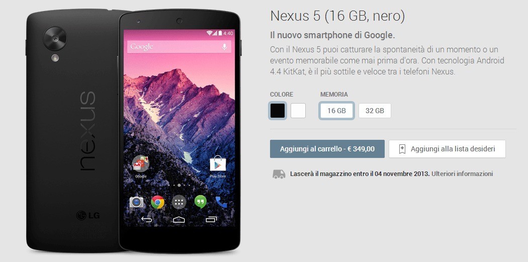 Ci siamo finalmente! Da pochi istanti è disponibile in tutto il mondo (Italia compresa) il nuovo ed attesissimo Nexus 5 di Google, acquistabile direttamente attraverso il Google Play Device ad un prezzo di 349€ per il modello da 16 GB di memoria interna e 399€ per il modello da 32 GB!