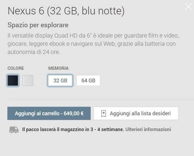 In realtà, lo smartphone è già presente da qualche settimana all’interno del Play Store, tuttavia non è stato mai acquistabile visto che riportava la dicitura “Disponibile a breve”. Il prezzo è ovviamente quello ormai noto e pari a 649€ per la versione 32GB e 699€ per la versione 64GB. Oltre alle due varianti di memoria, sarà possibile scegliere il colore blu notte o bianco e alcuni accessori acquistabili comunque separatamente. Tuttavia il Nexus 6 non sarà immediatamente spedito dopo aver concluso l’ordine, infatti bisognerà aspettare dalle tre alle quattro settimane prima che lo smartphone lasci i magazzini di Google.