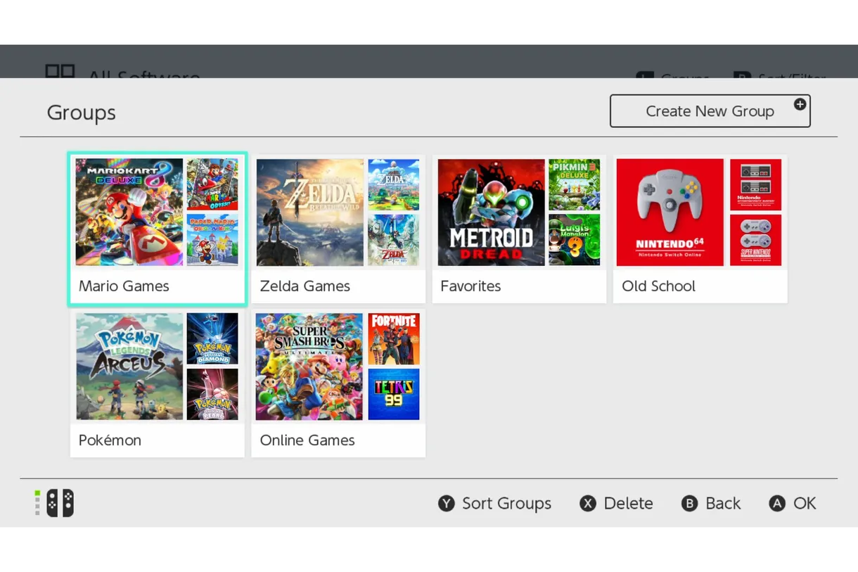 Essendo Nintendo, il sistema non funziona esattamente come ci si potrebbe aspettare. Pur ricalcando la funzione di una cartella, l casa di Kyoto li chiamata “gruppi” e purtroppo la loro implementazione si limita alla libreria “all software” e non nella home. Per chi vanta una libreria molto vasta, questa funzione permette finalmente di catalogare correttamente i titoli per creare dei singoli archivi che renderanno la navigazione più accessibile.