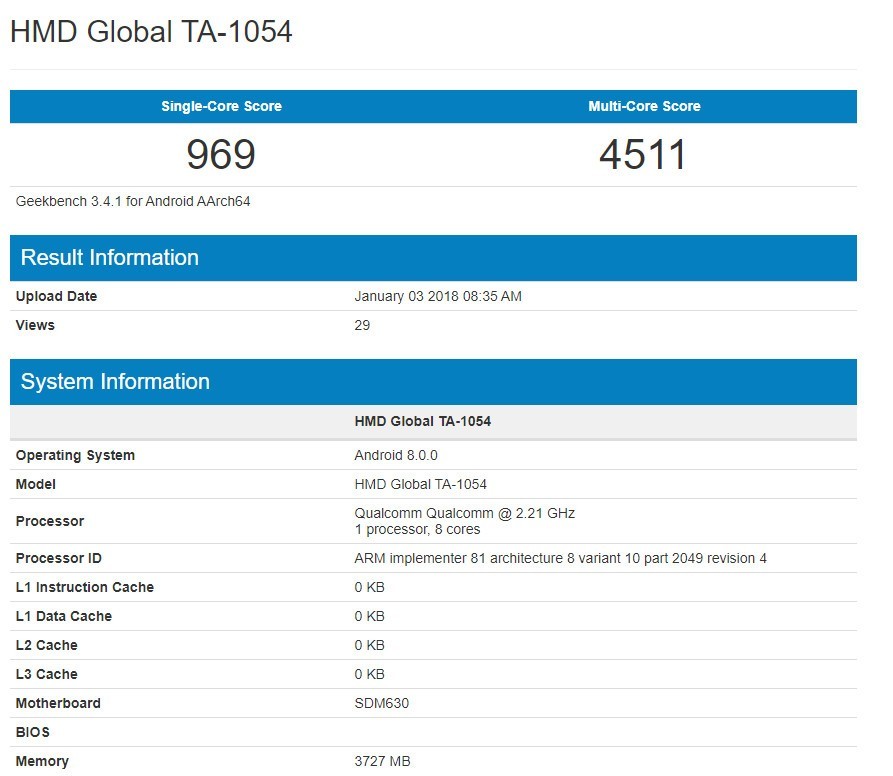 Si passa ora ai punteggi veri e propri. Nokia 6 2018 all’interno del test, pubblicato il 3 gennaio, quindi oggi,m è riuscito a totalizzare nella modalità Single Core 969 punti. Nella modalità Multi Core si sale a 4511 punti. Sappiamo che non sono punteggi esorbitanti, ma parliamo pur sempre di un medio gamma, quindi ci sta del tutto. Restiamo in attesa di informazioni sulla data di presentazione.