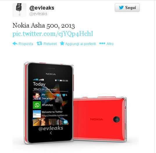 Sempre dal profilo twitter @evleaks pubblica un render del Nokia Asha 500, a primo impatto ci colpisce la nuova scocca trasparente, ma in realtà la cosa più importante è l’icona di Whatsapp sulla homescreen!
