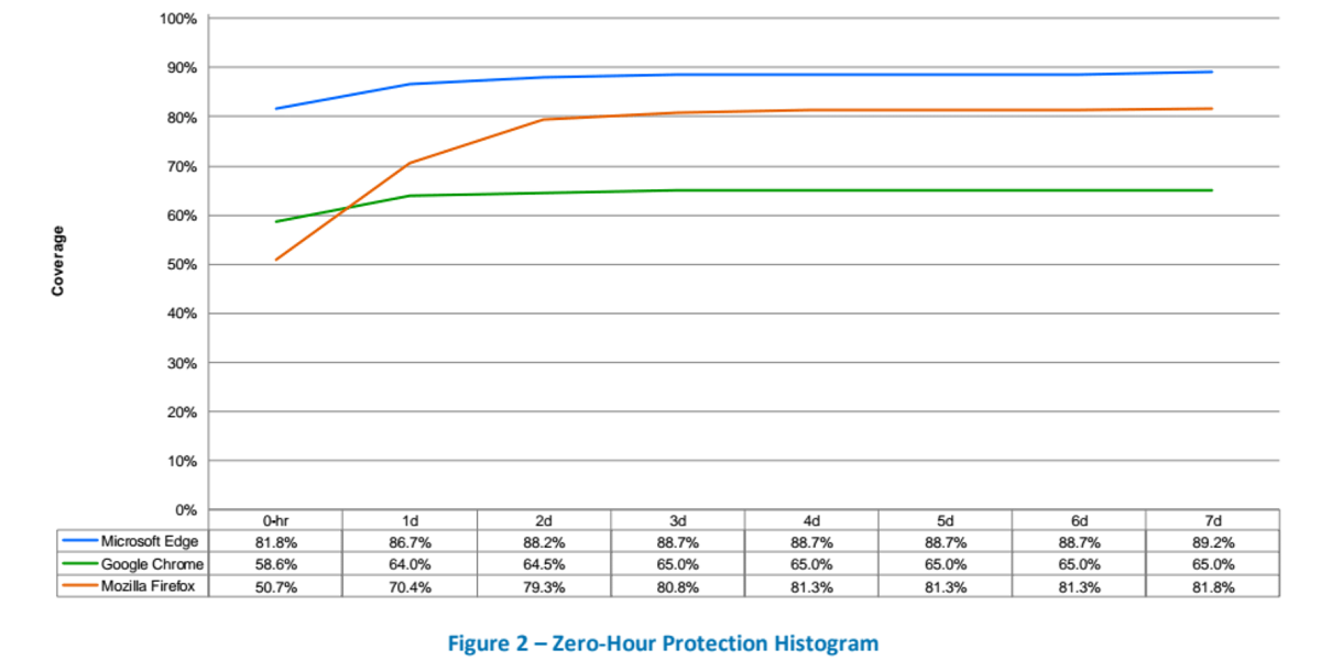 Il test si è basato su 36129 casi con 1136 URL sospetti in una finestra temporale di oltre 23 giorni nel periodo Agosto-Settembre ed ha visto protagonisti l’ultimo browser introdotto con il lancio di Windows 10, Microsoft Edge, l’ultima versione di Google Chrome e l’ultima release di Mozilla Firefox.