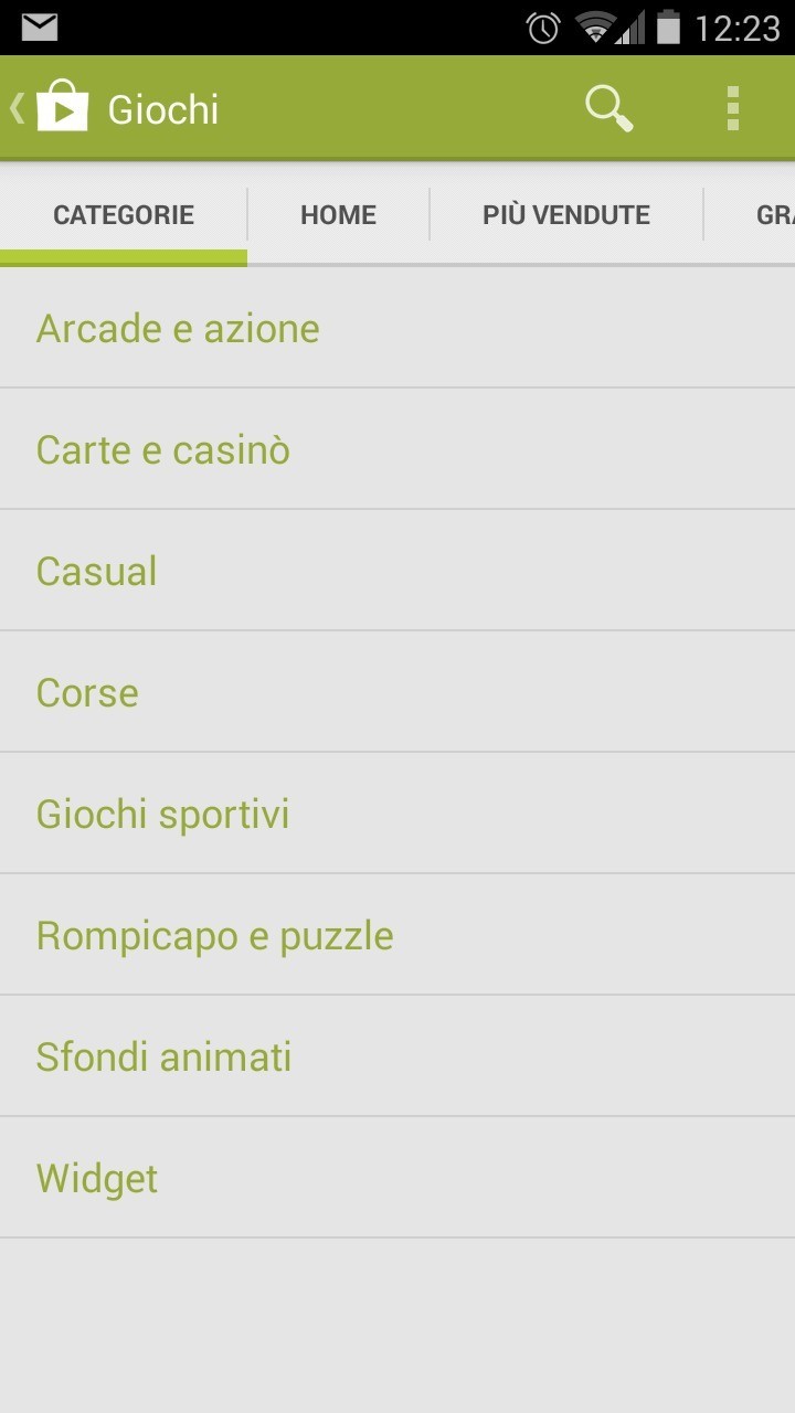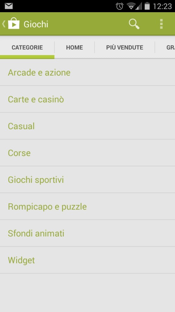 Se andate nel Play Store e cliccate su giochi, facendo swipe verso le categorie potrete vedere che attualmente ci sono otto scelte di categoria, due delle quali (widget e sfondi animati) che non sono delle vere e proprie scelte per i giochi.