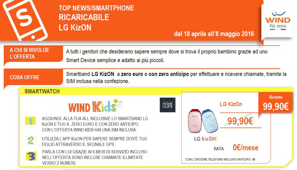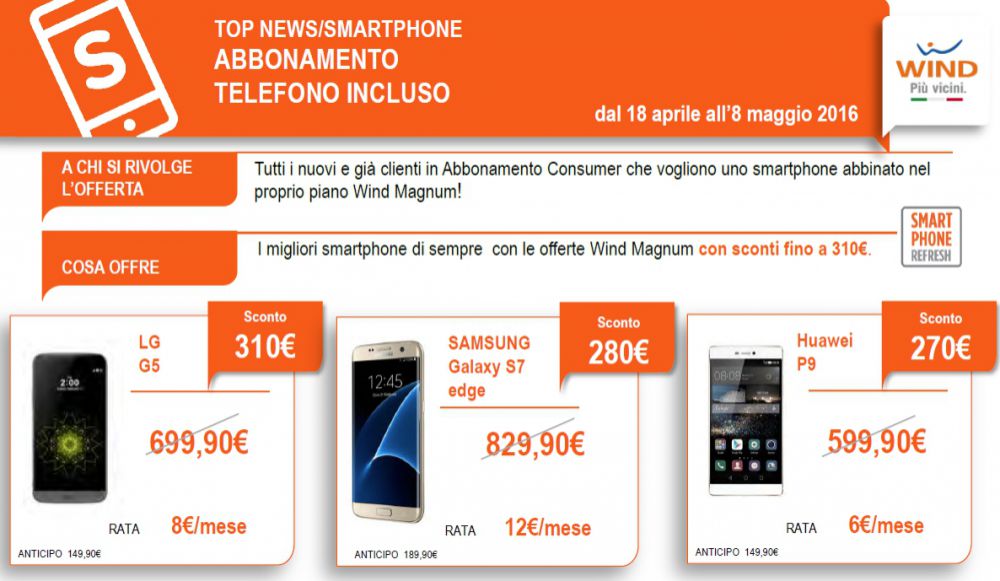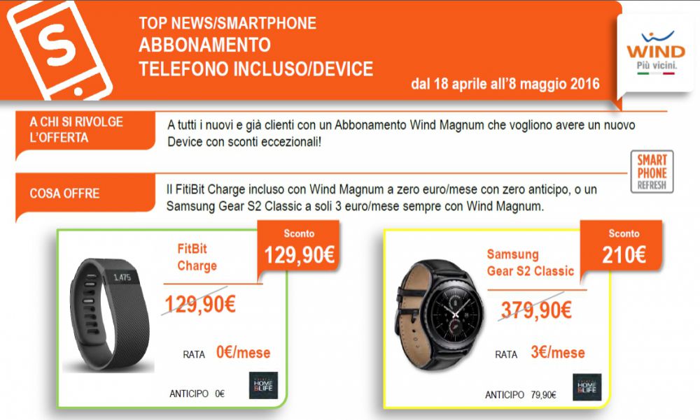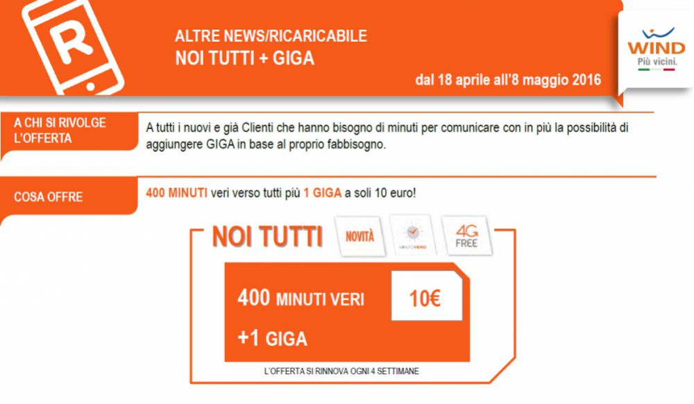 Tra le nuove offerte Wind trovano posto infine anche Noi Tutti + Giga (400 minuti verso tutti in aggiunta ad un gigabyte di Internet) ad un costo di 10 euro per quattro settimane e pacchetti indirizzati a tutti coloro i quali hanno un abbonamento Wind Magnum con smartphone (Samsung Galaxy S7, LG G5, Huawei P9) o indossabili (FitBit Charge e Samsung Gear S2 Classic) inclusi. Di seguito tutte le immagini riepilogative delle nuove offerte Wind attivabili a partire da lunedì 18 aprile.