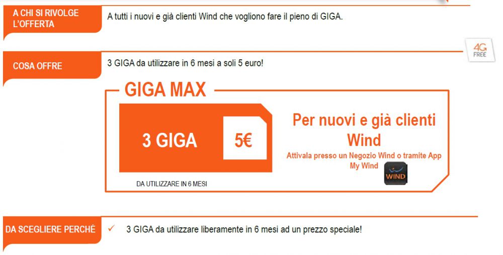 Nel novero delle nuove offerte Wind sarà altresì presente Giga Max, pronta a strizzar l’occhio a tutti i suoi clienti ma anche ai nuovi. L’operatore arancione mette a disposizione 3 gigabyte di Internet per un totale di sei mesi previo il pagamento una tantum di cinque euro. L’offerta è autodisattivante allo scadere dei 180 giorni e non sarà rinnovata a cadenza mensile, indi per cui i tre gigabyte dovranno esser spalmati entro il termine dei sei mesi e con un unico contatore; da tenere a mente che Giga Max è incompatibile con i piani Noi Tutti Special Edition, Voce e Internet, Wind Kids.