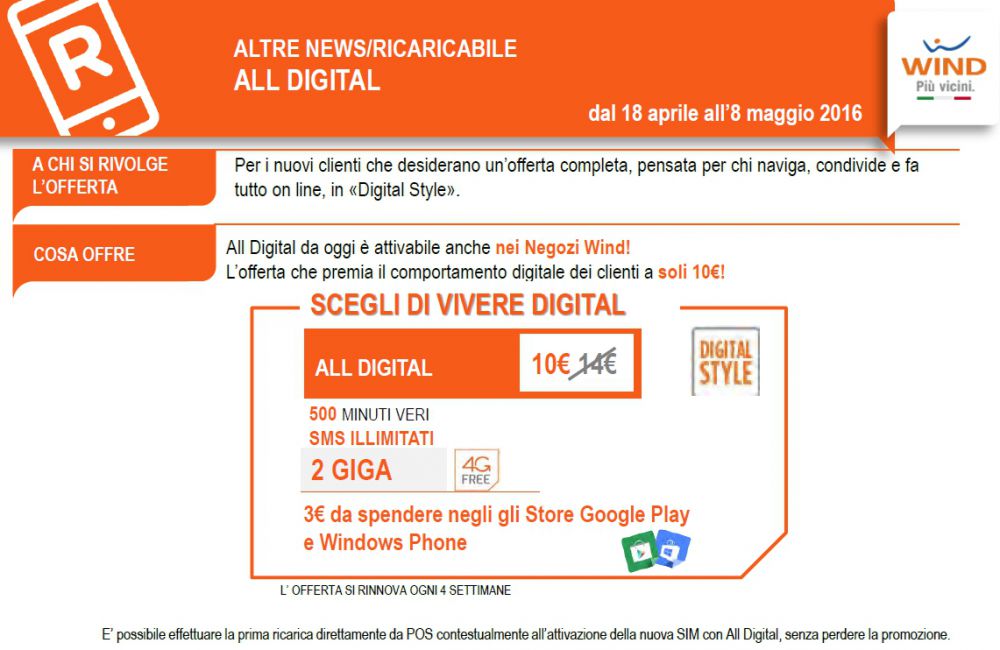 Nel calderone di promozioni è presente la nuova Wind All Digital, che prevede ad un costo mensile di dieci euro (in luogo di 14 euro originariamente previsti) la possibilità di fruire di 500 minuti verso tutti (con tariffazione al secondo), SMS illimitati e 2 gigabyte di Internet in 4G; l’offerta Wind di cui trattasi dovrà tuttavia essere attivata tramite i canali digitali dell’operatore arancione (App MyWind o su Wind.it). Scontata anche la All Inclusive, la cui promozione sarà attivabile dai clienti ADSL/Fibra e prevede, previo esborso di 6 euro mensili, 500 minuti verso tutti al secondo, 500 SMS verso tutti e 2 gigabyte di Internet in 4G.