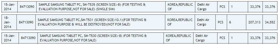 Samsung ha tracciato le linee guida per il 2014, vuole sbaragliare la concorrenza con una gamma di nuovi prodotti senza precedenti. Le notizie arrivano sempre dal sito di import Export indiano Zauba e dal sito di Bluetooth SIG; i tablet scoperti sono tre e vengono etichettati con il numero di modello SM- T530 , SM- T535 , e SM- T531 , due con schermo da 8 pollici e uno con schermo da 10.1 pollici.