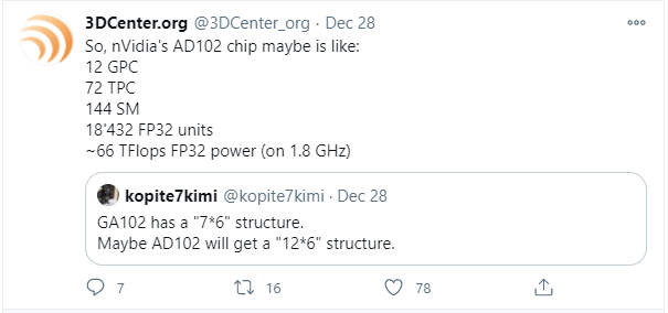 Il principale chip di questa architettura, chiamato AD102, potrà trasportare 72 Texture Processor Cluster (TPC) e ben 144 Streaming Multiprocessor (SM), seguendo le informazioni trovate sul sito tedesco 3DCenter, completato poi dal tweet di Kopite.