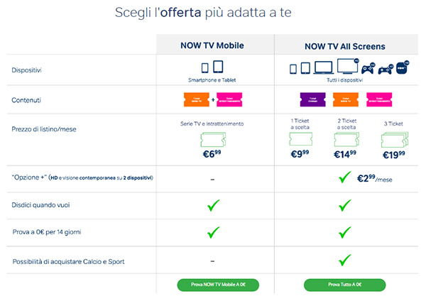 Rispetto al più classico e conosciuto Now TV All Screens, che ad un costo di 9,99 euro per singolo ticket è disponibile anche su grande schermo, il nuovo Now TV Mobile è disponibile esclusivamente in mobilità su smartphone e tablet senza la qualità in HD, qui non necessaria, ad un costo complessivo di 6,99 euro per i ticket “Intrattenimento” e “Serie TV”, con dirette e programmi on demand senza alcun vincolo di abbonamento o rinnovo obbligatorio.