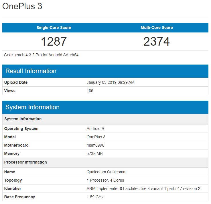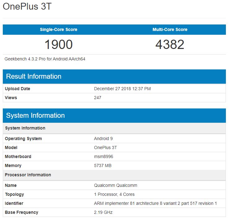 Nei database della piattaforma di benchmarking, GeekBench, sono comparsi in queste ore i risultati dei test per OnePlus 3 e OnePlus 3T, i quali mostrano l’esecuzione di un software basato sul sistema operativo di Android 9 Pie.