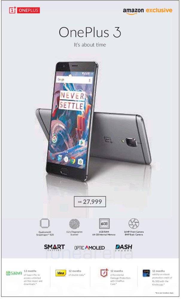 In India infatti il nuovo OnePlus 3 sarà proposto ad un prezzo di listino al lancio di 27.900 Rupie Indiane pari, all’attuale cambio, a circa 369€ per un rapporto qualità/prezzo imbattibile in questa fascia di prezzo!