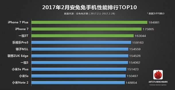 Focalizzando l’accento alle performance globali, iPhone 7 Plus di Apple riesce a consolidare la sua posizione di primo piano raggranellata ormai da diversi mesi. Il dispositivo – che può fregiarsi del risultato monstre di 184981 – è seguito a ruota dal più tradizionale iPhone 7 (che ha una velocità di clock leggermente inferiore), mentre sul campo Android è proprio OnePlus 3T a svettare sulla concorrenza ed a guadagnare, in via generale, la terza piazza della top dieci AnTuTu di febbraio.