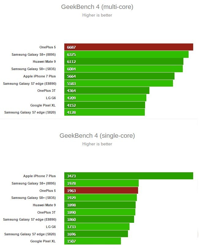 Nelle immagini trapelate da poche ore, OnePlus 5 riesce a totalizzare un punteggio di 1963 punti in single-core ed addirittura 6687 punti in quella multi-core. Allo stato attuale Galaxy S8+ ed Xperia XZ Premium sono i due dispositivi di punta del 2017 ad adottare lo stesso SoC Snapdragon 835 del nuovo OnePlus 5 e quindi perfetti per questa prima comparativa.