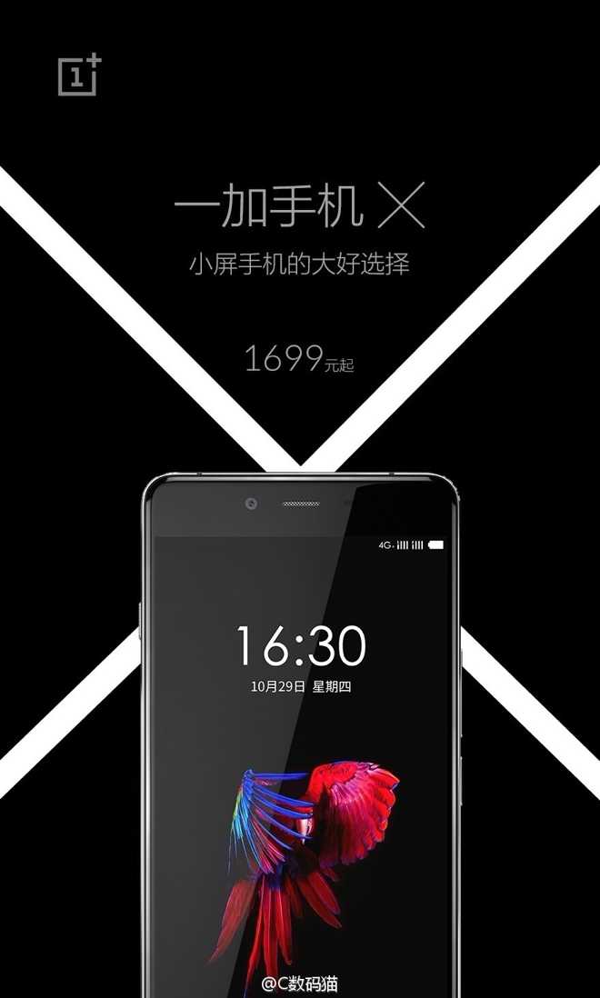 OnePlus con un display da 5 pollici del futuro OnePlus X farà un primo tentativo di diversificare la sua linea di smartphone, che finora si compone di due modelli da 5.5 pollici: il OnePlus One e il OnePlus 2. Dunque è alta l’attesa per il OnePlus X che dovrebbe portare una risoluzione fino a 1080p in uno smartphone dalle dimensioni contenute (140 x 69 x 6,9), con fotocamera posteriore da 13 megapixel e anteriore da 8 megapixel e 3 GB di RAM con archiviazione interna da da 16/32 GB. Non parliamo certo di un top di gamma me nemmeno di una entry level. L’unica caratteristica su cui la OnePlus poteva sicuramente fare meglio è legata al processore che sembrerebbe essere l’ormai datato Snapdragon 801. In ogni caso è trapelata l’immagine di copertina dell’evento di presentazione di OnePlus X che mostra la presunta parte anteriore del dispositivo, che verrà svelato il 29 ottobre e anche il suo prezzo di vendita in cina che si aggira a 1.699 yuan ($ 267).