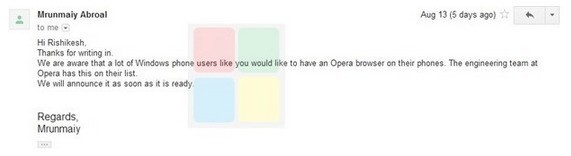 “Sappiamo che molti utenti di Windows Phone come te vorrebbero avere un browser Opera sul proprio dispositivo. Il team di sviluppo di Opera ha questa attività tra quelle in sviluppo. Presto annunceremo delle novità”