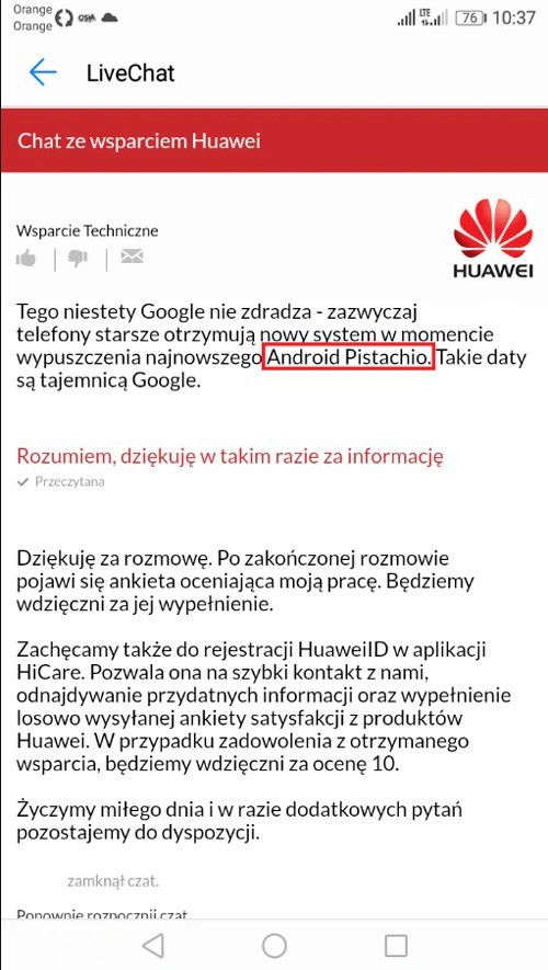 Un utente ha contattato l’assistenza Huawei, divisione Polonia, all’interno della mail un dipendente si è lasciato sfuggire il nome ufficiale del prossimo aggiornamento Android. È impossibile non notare quell’Android Pistacchio.