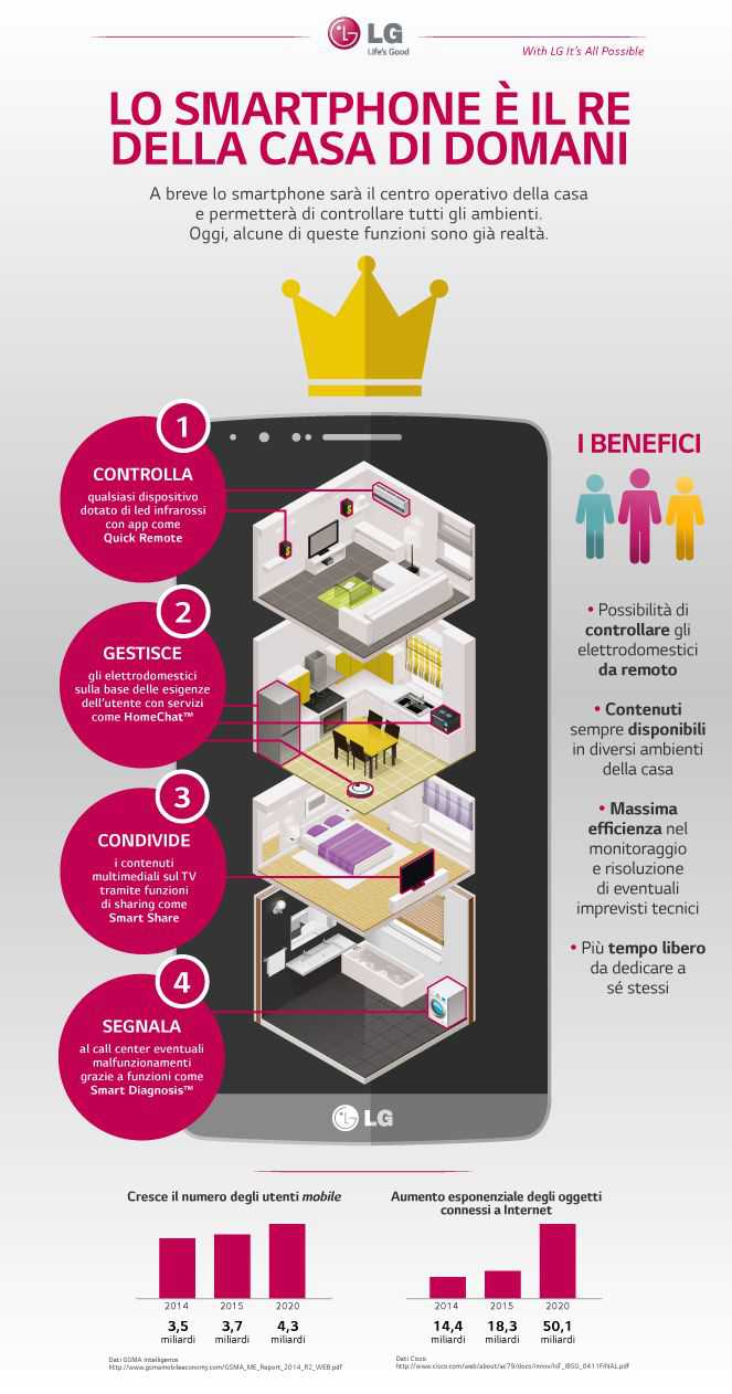 Entro il 2015, il numero dei dispositivi connessi a internet è destinato ad aumentare fino a 15 miliardi, il doppio della popolazione mondiale, come mostrato da un recente studio effettuato da Cisco. Ma smartphone, tablet e altri device non verranno più utilizzati soltanto per le loro funzioni primarie, potranno infatti creare una convergenza sempre più completa in grado di generare una serie di benefici aggiuntivi per l’utente e per LG lo smartphone è il re della casa di domani, come evidenziato dalla iconografica sottostante.