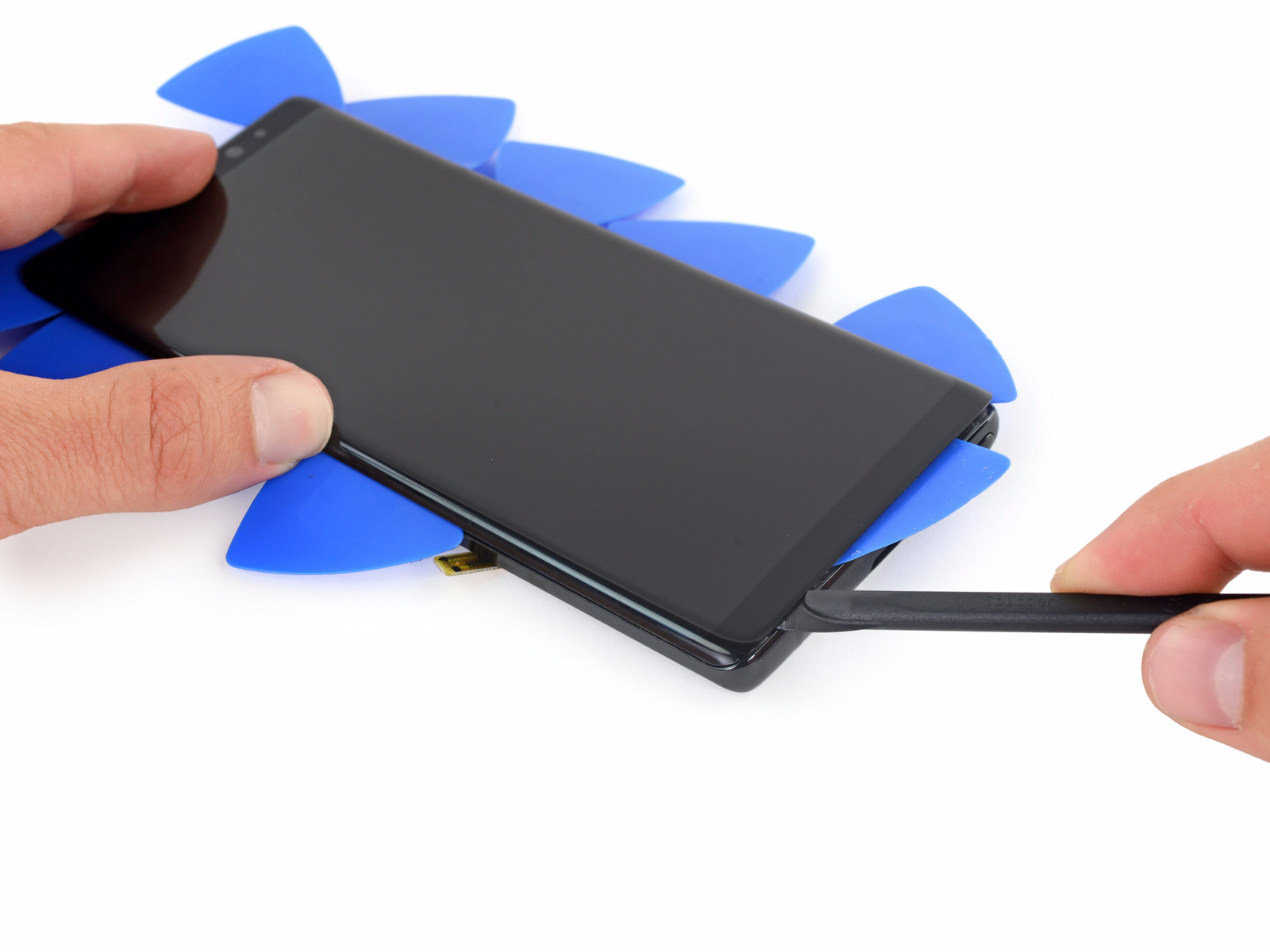 Il processo di teardown Galaxy Note 8 inizia con la rimozione del pannello posteriore in vetro con l’ausilio dello strumento iOpener per ammorbidire l’adesivo che mantiene saldo il componente. Già da qui il team nota che, durante la rimozione della back-cover, il cavo del sensore di impronte digitali potrebbe essere danneggiato. La buona notizia sta nel fatto che molte componenti sono tenute insieme attraverso le viti Philips di ottima qualità. Dopo aver rimosso i connettori per la ricarica wireless ed il telaio centrale è possibile vedere la batteria al centro del dispositivo, posizione differente rispetto alle generazioni precedenti di Galaxy S e Galaxy Note, tenuta ferma con la colla.
