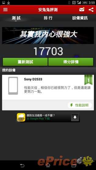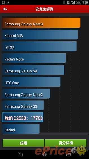 Dopo questo preambolo, come indicato dal titolo del post, il selfie phone è già stato messo alla prova e, secondo i risultati di Antutu, ha raggiunto un punteggio di 17.703, in linea con dispositivi come il Moto G, il Google Nexus 4, e il Samsung Galaxy S3. In altre parole, mentre l’Xperia C3 è lontano dai migliori modelli in commercio è comunque un ottimo dispositivo di fascia media, l’unico dubbio che rimane è legato al prezzo di vendita, che è ancora sconosciuto.