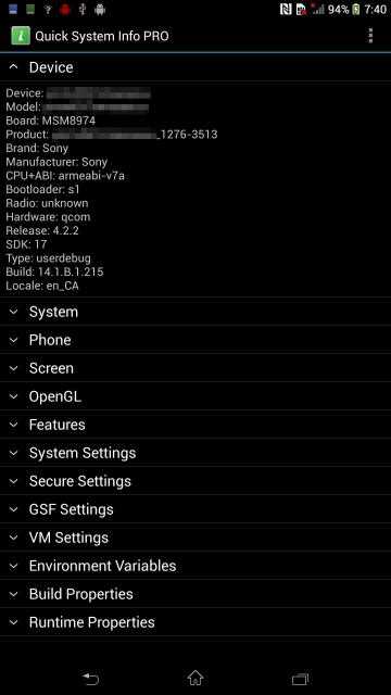 Cominciano ad arrivare i primi screenshot prelevati direttamente dal nuovissimo Sony Xperia ZU! Questi screenshots arrivano da un prototipo e mostrano le specifiche hardware e la potenza di questo futuro top di gamma.