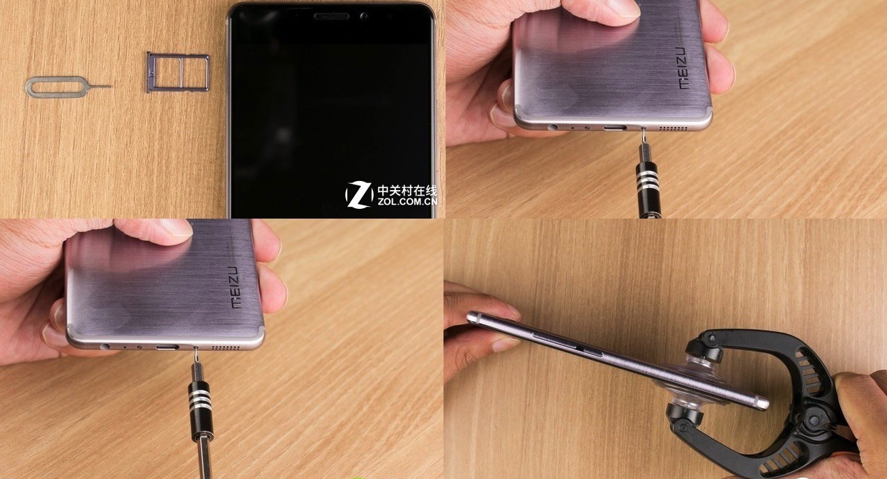Meizu Pro 7 e Pro 7 Plus sono fondamentalmente identici, ma il teardown si concentra sul modello Plus genericamente più richiesto dal pubblico. La prima operazione svolta è stata la rimozione del carrello che contiene la SIM. Sul bordo inferiore, dove si mostrano il connettore per le cuffie, USB Type-C ed altoparlante, sono presenti due viti che non sono facili da rimuovere.