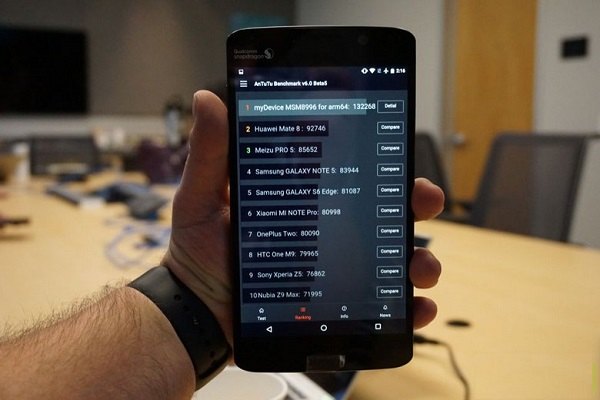 Nel test, il device montava un processore a 64-bit quad-core Snapdragon 820 MSM8996 con architettura big.LITTLE costituito da due core da 2.1GHz e due core da 1.6GHz e coadiuvato da una GPU Adreno 530. Lo smartphone dimostrativo invece, possedeva un display da 6.17” con risoluzione di 2560×1600 pixel e densità di 489ppi, 3GB di RAM e 10GB di memoria interna.