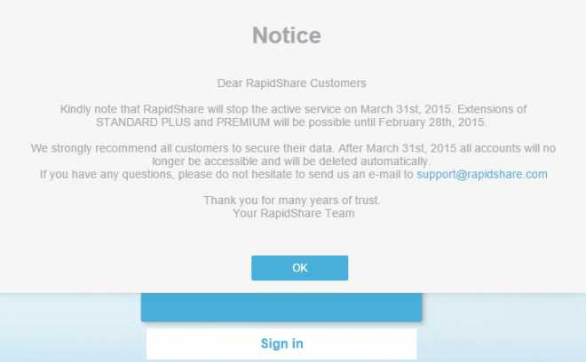 Il team di Rapidshare ha comunicato che la chiusura del servizio riguarderà anche i possessori di account Standard Plus e Premium che avranno comunque possibilità di accedere al servizio fino al 28 febbraio 2015, al fine di scaricare e mettere al sicuro ogni dato presente sugli storage di Rapidshare.