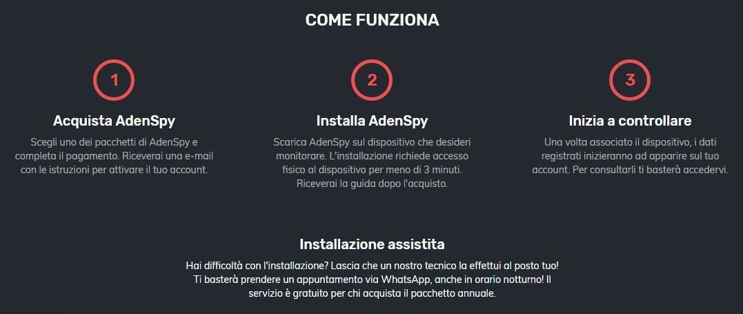 Se avete deciso di acquistare AdenSpy non vi resta altro che visitare il sito ufficiale e seguire le istruzioni dalla voce Acquista. Il software (da installare sul telefono da controllare) è scaricabile direttamente dal sito di AdenSpy e sarà utilizzabile solo dopo aver acquistato un abbonamento ed aver ricevuto il codice di attivazione