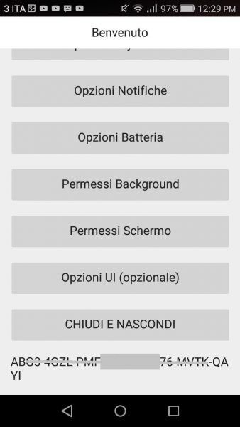 - A questo punto dovete inserite il codice alfanumerico fornito al momento dell’installazione del file apk;