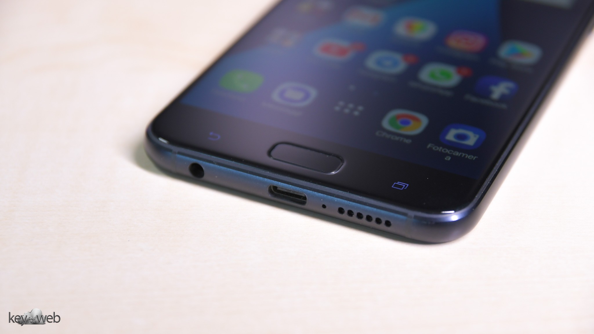 Parte anteriore che presenta in basso il tasto home soft-touch, che comprende anche il sensore per il riconoscimento delle impronte digitali, ed i tasti back e multitasking. Nella parte alta, invece, è presente un LED di notifica nella capsula audio interna, i sensori di prossimità e luminosità e la fotocamera frontale.