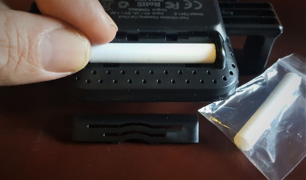 Si esatto avete capito bene!!! Infatti se fate attenzione alle immagini che vi abbiamo allegato, guardando l’immagine in basso, vi renderete conto che il retro del dispositivo è dotato di un piccolo sportellino con delle alette forate, in cui una volta aperto è possibile inserire il piccolo tampone in dotazione. Il prodotto viene fornito con uno stick pre-profumato e ben due stick neutri che potrete utilizzare a vostro piacimento con una qualsiasi essenza per deodorare la vostra auto.