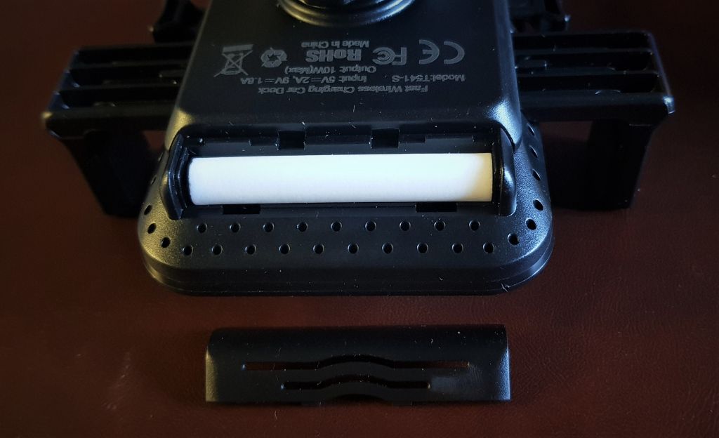 Choetech con questo prodotto punta a catturare l’attenzione di noi consumatori che come me, hanno bisogno di un comodo e saldo porta cellulare in auto senza però dover rinunciare alla possibilità di poterlo comodamente tenere in carica mentre si è immersi nel caos urbano. Il fissaggio alla macchina viene effettuato attraverso una semisfera che viene poi ancorata saldamente ai bocchettoni dell’aria, mentre per l’alloggiamento del cellulare, troviamo un soffice pad avvolto da due linguette laterali che si bloccano a scatto con il peso del dispositivo, tenendo ancorato ed immobile lo smartphone anche in caso di manto stradale sconnesso. Un particolare che non volevamo assolutamente trascurare e di cui vi volevamo parlare, è la possibilità di utilizzare il porta cellulare da auto come un vero e proprio diffusore di aromi.
