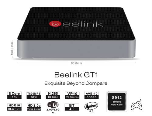 Nonostante sia disponibile su GearBest ad un prezzo di circa 50€, la TV Box Beelink GT1, realizzata in plastica ma con una buona qualità costruttiva, è dotata di caratteristiche di assoluto livello: troviamo a bordo il SoC AMlogic S912 octa-core Cortex-A53 da 2 GHz, GPU Mali-820MP3 a 750 Mhz, 2 GB di RAM, 16 GB di memoria interna, Wi-Fi ac Dual Band 2.4GHz / 5.8GHz e sistema operativo Android 6.0.1 Marshmallow. Il dispositivo dispone di codifica hardware 4K VP9, 4K 10-bit H.265 e 4K H.264.