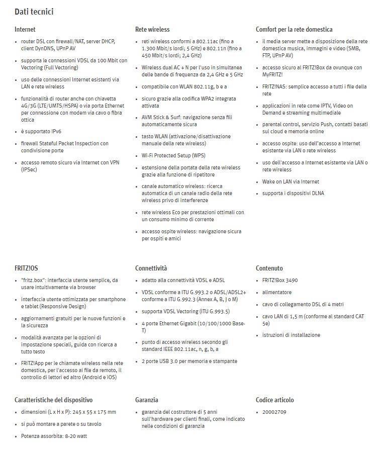 [amazonjs asin=”B00Q2HYVJG” locale=”IT” title=”AVM FRITZ! Box 3490 International Modem Router Wireless AC 1750, Dual Band (2,4 e 5 GHz) 1300 + 450 Mbit/s, ADSL2+, VDSL, 4 LAN Gigabit, 2 USB 3.0, Software e Istruzioni in Italiano”]