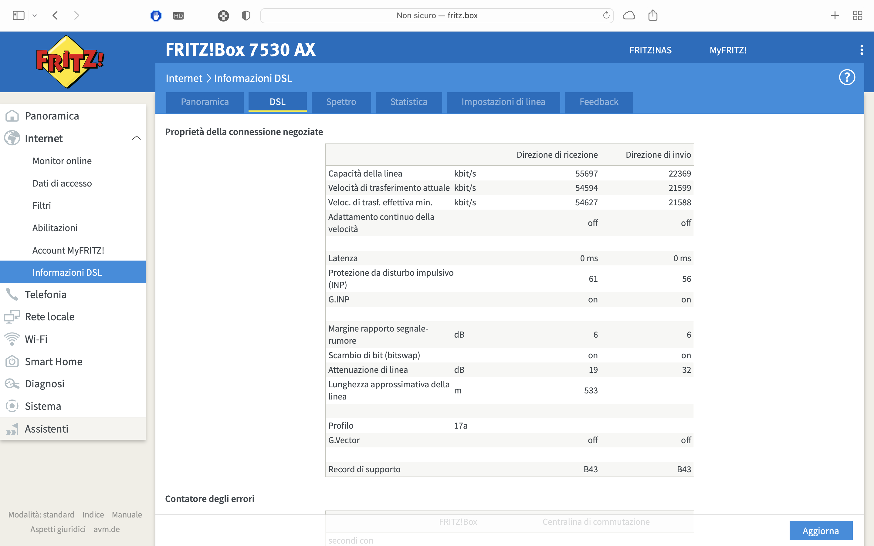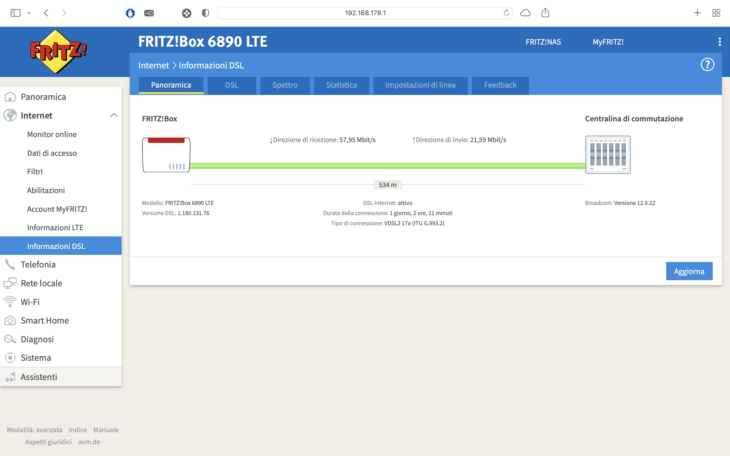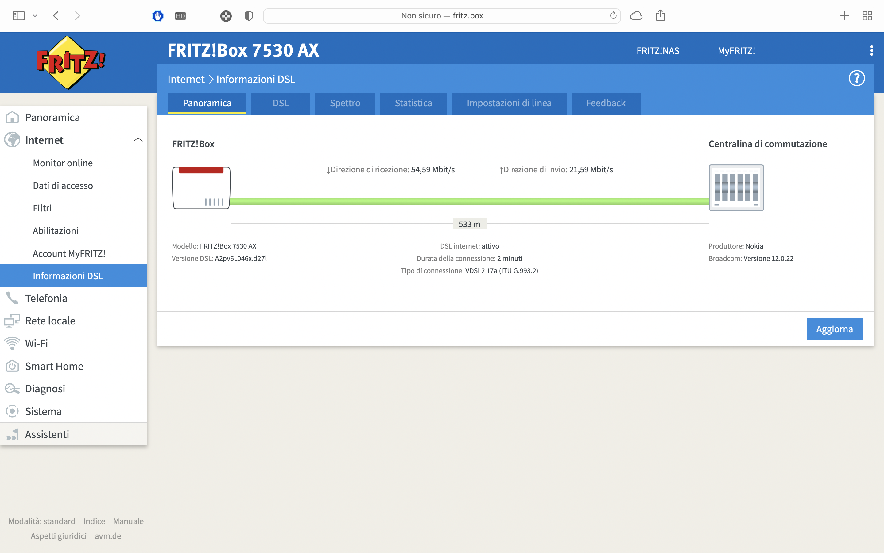 Nel nostro caso specifico, in ufficio abbiamo una rete FTTC 100 Mbit/s con una distanza dalla cabina di circa 500 metro con il Fritz!Box 7590 che consente di raggiungere circa 54 / 58 Mbit/s in download e 20 Mbit/s in upload, mentre il Fritz!Box 7530 AX ha sempre agganciato ad una velocità leggermente inferiore, circa 50 Mbit/s in download e 20 Mbit/s in upload. La particolarità è che l’apparato installato a monte, nell’armadio del nostro Provider, è proprio un Broadcom, stessa marca che ora equipaggia questo Fritz!Box 7530 AX e che ci aveva fatto immaginare, sbagliando, di poter raggiungere prestazioni maggiori.