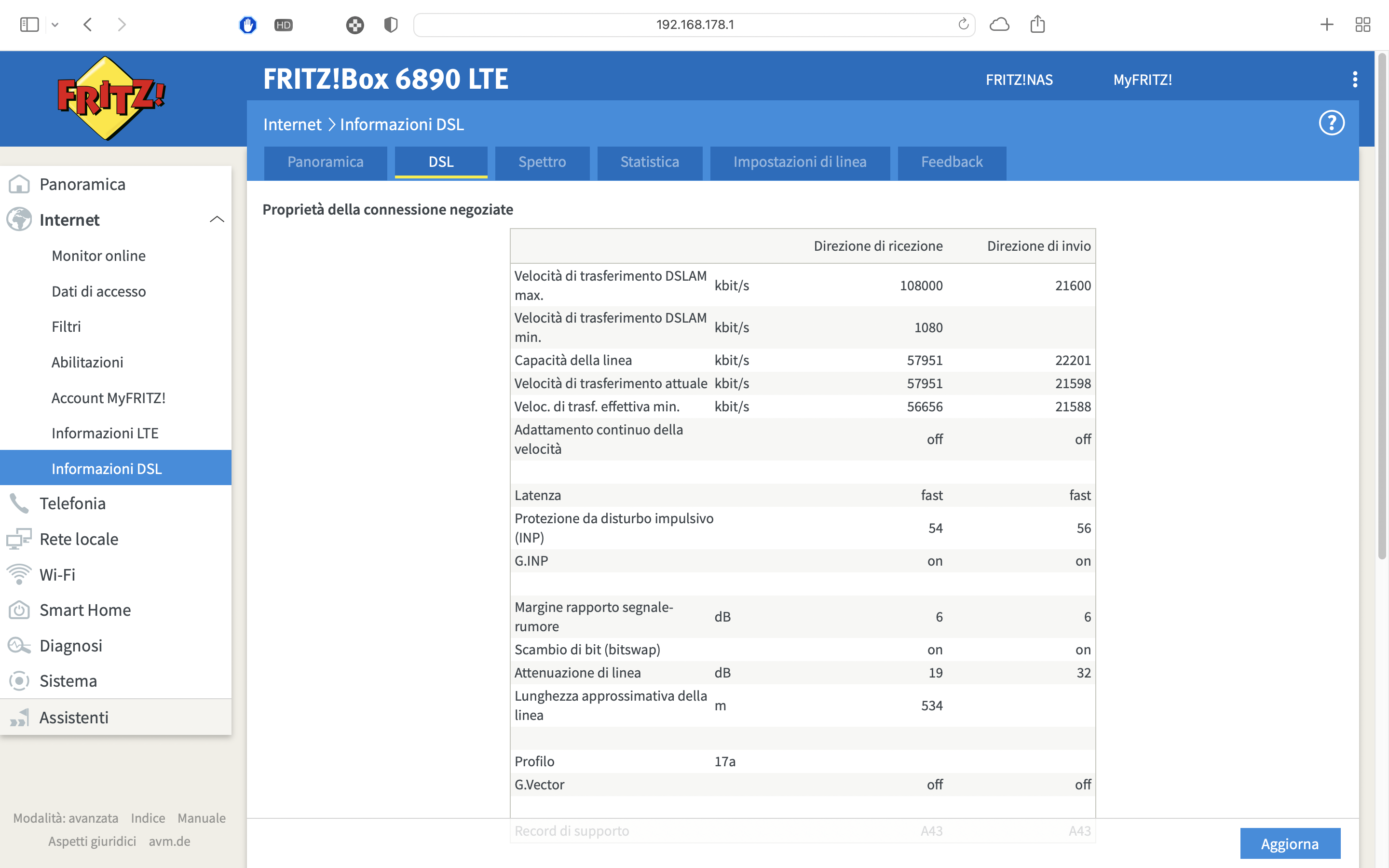 Altra piccola novità, ma negativa, è la mancanza in questo modello dotato di chipset Broadcom della classica pagina di configurazione avanzata della linea che contiene i parametri di collegamento che solitamente consento di variare la velocità di connessione per gestire al meglio quelle connessioni FTTC od ADSL un pò più problematiche e da sempre presente nel sistema operativo Fritz!OS.