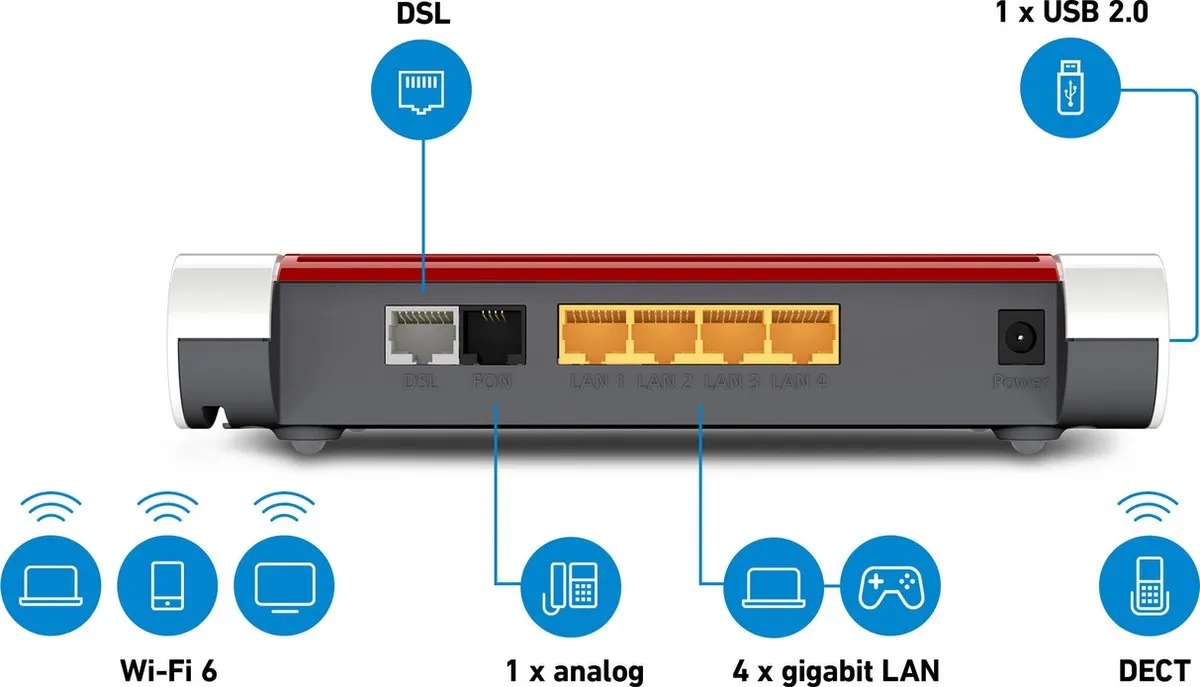 Fratello minore del top di gamma Fritz!Box 7590 AX, il Fritz!Box 7530 AX supporta reti FTTH (tramite porta LAN/WLAN), FTTC fino a 300 Mbit/s (supervectoring 35b) ed ADSL, disponendo inoltre di gestione Voip, Media Server, Nas e molto altro ancora.